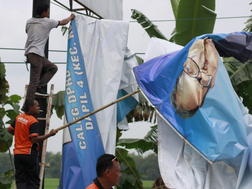 Sejumlah baliho ukuran besar dibersihkan menggunakan mobil crane. Menurut Lulus ada sekitar 15 titik yang dibersihkan menggunakan crane yang mayoritas Baliho milik caleg. Termasuk satu baliho ukuran super besar yang membutuhkan waktu lama saat penertiban. “Yang jelas saat masa tenang tidak boleh dilakukan aktivitas kampanye, pemasangan APK sehingga harus bersih termasuk di posko relawan, rumah caleg dan yang dipasang pada lahan milik pribadi,” jelasnya. Pembersihan tidak hanya satu hari saja, tetapi selama masa tenang akan tetap melakukan penyisiran dan patroli, jika ada APK yang masih terpasang maka akan dibersihkan segera. Hal itu untuk memastikan kalau satu hari sebelum hari Pemungutan Suara sudah tidak ada lagi APK yang terpasang . Banyaknya APK tersebut karena menjelang masa tenang cukup banyak caleg yang kembali memasang APK.