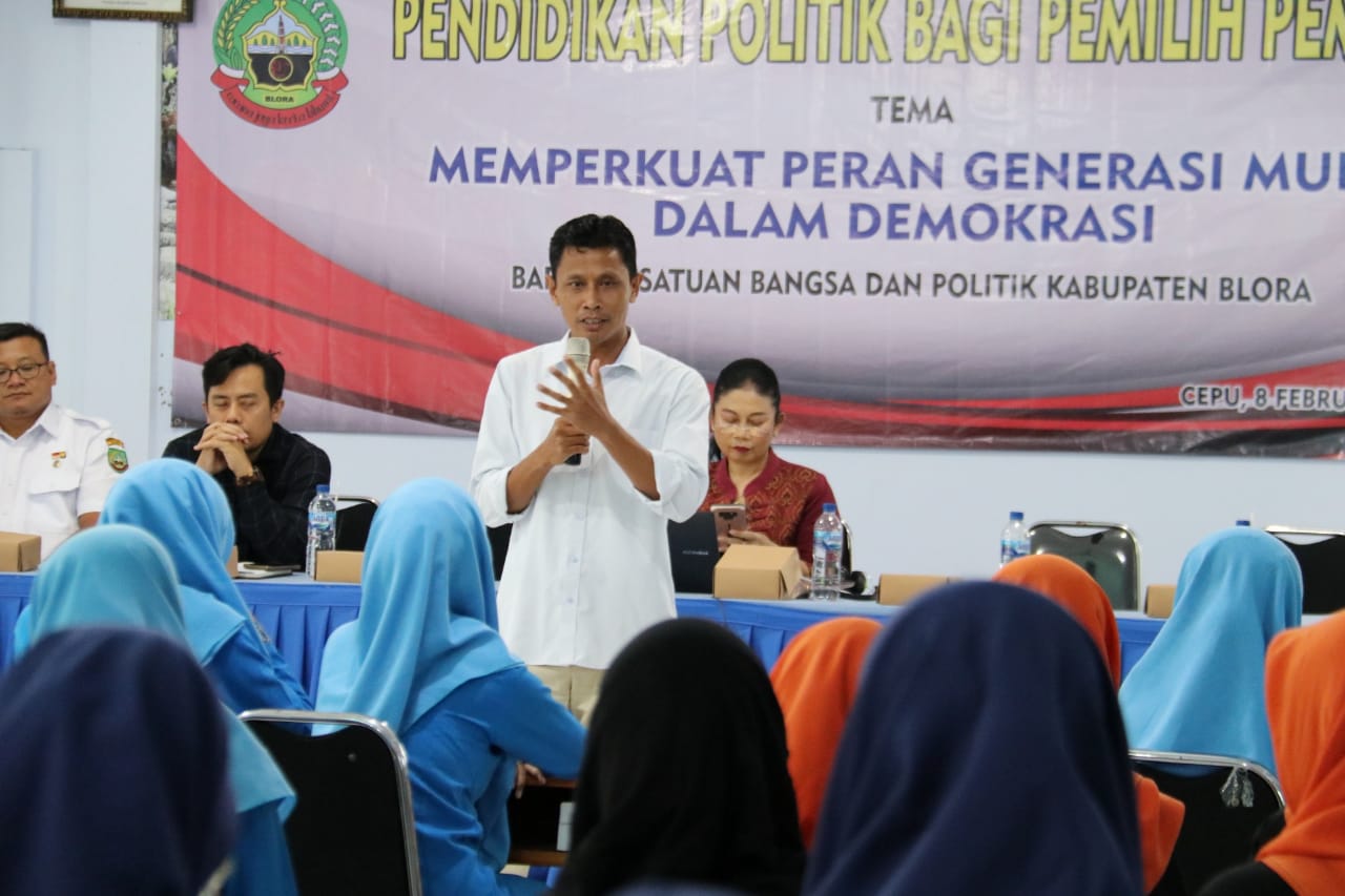 Blora - Anggota Bawaslu Kabupaten Blora Sugie Rusyono mengajak kalangan muda untuk terlibat aktif dalam memastikan proses pemilu berjalan demokratis. Hal itu disampaikan Sugie dalam kegiatan pendidikan politik bagi pemilih pemula yang digelar Badan Kesatuan Bangsa dan Politik di SMK N 1 Cepu, Rabu (8/2/2023).