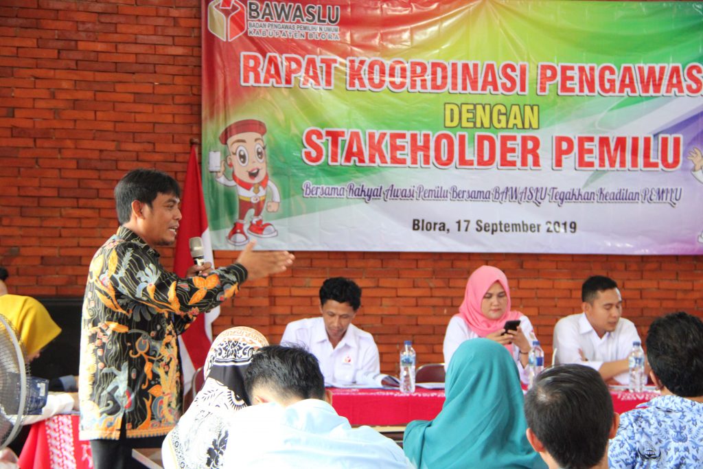 Blora - Rapat Koordinasi Pengawasan dengan Stakeholder Pemilu digelar Bawaslu Kabupaten Blora dalam rangka evaluasi pemilu Tahun 2019 di Blora disalah satu rumah makan Embungrowo Karangjati, Blora, Selasa (17/9/2019).