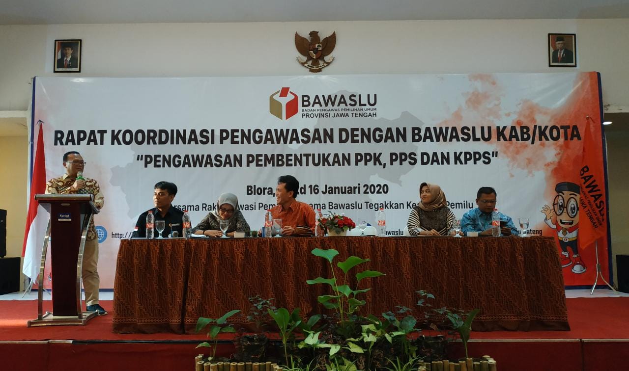 Cepu - Mengawali tahun 2020 Bawaslu Provinsi Jawa Tengah adakan koordinasi bersama 21 Kabupaten/Kota yang melaksanakan Pilkada. Kegiatan Rapat Koordinasi dengan tema “Pengawasan Pembentukan PPK, PPS dan KPPS” ini melibatkan Divisi Pengawasan dan Divisi SDM Bawaslu Kabupaten/Kota. Dalam Rakor ini juga dihadiri beberapa pimpinan Bawaslu Jateng untuk memberikan arahan sesuai dengan divisi yang digeluti sekaligus memantik semangat kerja mengawali Tahun 2020.(15/01/20)