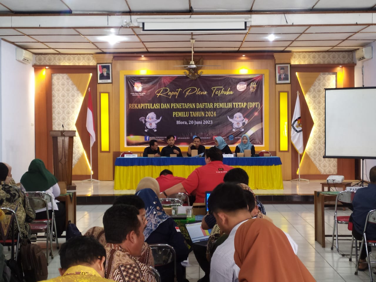 Blora - Daftar Pemilih Tetap (DPT) Pemilu 2024 telah ditetapkan KPU Kabupaten Blora melalui rapat pleno terbuka rekapitulasi dan penetapan DPT di gedung PKPRI pada Selasa (20/6/2023). Dalam pleno tersebut, KPU menetapkan jumlah Daftar Pemilih Tetap di Kabupaten Blora adalah 704.285 yang terdiri dari 349.413 pemilih laki-laki