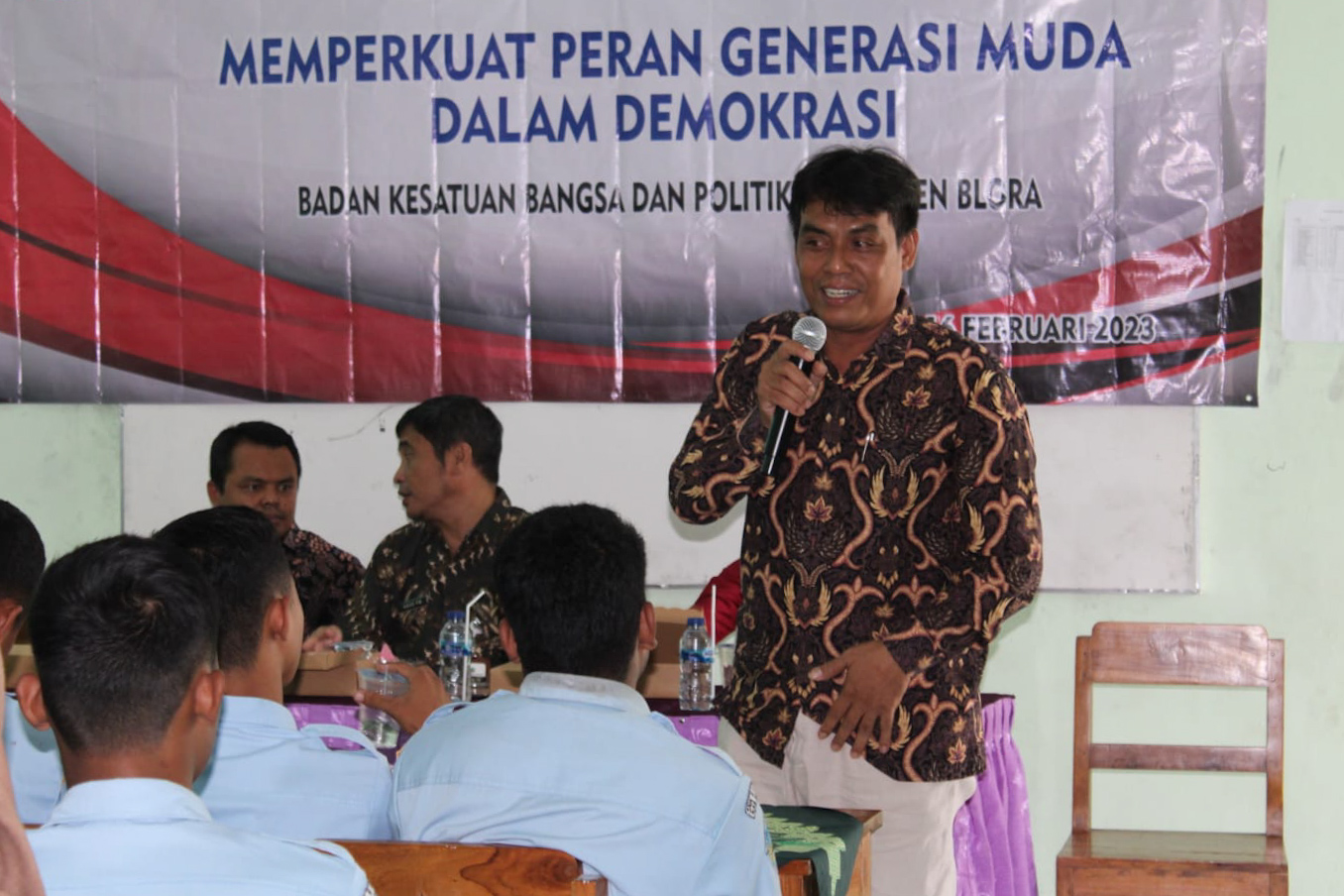 Blora,- Ketua Bawaslu Kabupaten Blora Lulus Mariyonan menyampaikan bahwa pemilih pemula akan berperan penting dalam Pemilu Serentak 2024, khususnya dalam melawan politik uang. Hal itu disampaikannya dalam Pendidikan Politik Bagi Pemilih Pemula di SMKN 1 Jati, Blora, Kamis, (16/2/2023).