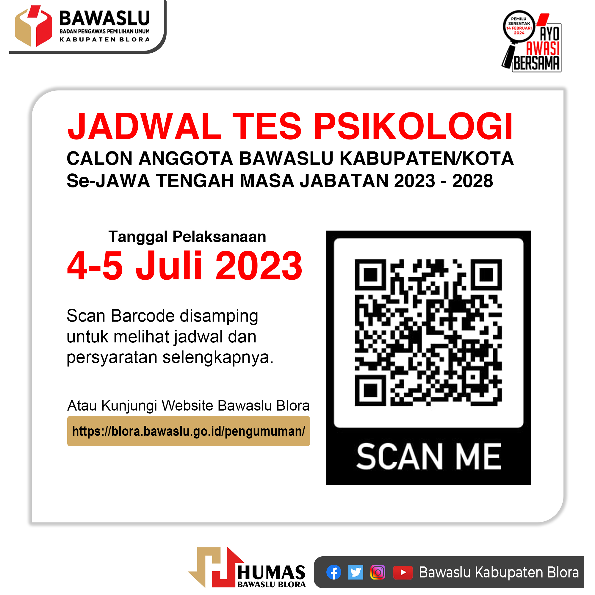 Peserta tes psikologi diwajibkan: 1. Hadir pukul 06.00 WIB untuk melakukan registrasi; 2. Peserta hanya bisa mengikuti tes psikologi pada hari/tanggal/lokasi sesuai dengan jadwal yang telah ditentukan; 3. Wajib membawa kartu peserta dan identitas diri (KTP/ Kartu Keluarga asli atau fotocopy yang dilegalisir) dan ditunjukkan kepada panitia pelaksana sebelum memasuki ruang tes dan akan diverifikasi oleh petugas yang ditunjuk Bawaslu; 4. Bagi peserta yang terlambat 30 menit setelah pelaksanaan tes dimulai atau salah waktu/lokasi ujian tidak diperkenankan mengikuti tes psikologi; 5. Menggunakan pakaian atasan warna putih, celana panjang/rok warna hitam/gelap dan menggunakan sepatu. Bagi wanita yang menggunakan hijab dapat menyesuaikan; 6. Peserta memasuki ruang tes hanya diperbolehkan membawa alat tulis pribadi (wajib dibawa: alas tulis, pensil HB, penghapus, rautan dan ballpoint); 7. Peserta dilarang saling meminjam peralatan (alat tulis, perlengkapan pribadi) dengan sesama peserta lainnya; 8. Peserta memasuki ruang tes psikologi dilarang membawa alat komunikasi, senjata api/ tajam, jam tangan, jaket, tas, buku catatan, alat hitung dan alat lain yang berbasis teknologi; 9. Bilamana terdapat peserta yang tidak terdata dalam daftar tes psikologi, tidak dapat mengikuti tes psikologi; 10. Peserta diharapkan sudah makan pagi sebelum pelaksanaan tes psikologi; 11. Peserta tes psikologi khusus gelombang pertama (4 Juli 2023) wajib mengikuti gladi bersih yang akan dilaksanakan pada tanggal 3 Juli 2023 pukul 06.00 WIB sesuai pembagian lokasi terlampir; 12. Peserta yang berhak mengikuti Tes Psikologi adalah peserta yang dinyatakan lulus penelitian administrasi dan telah mengikuti Tes Tertulis.