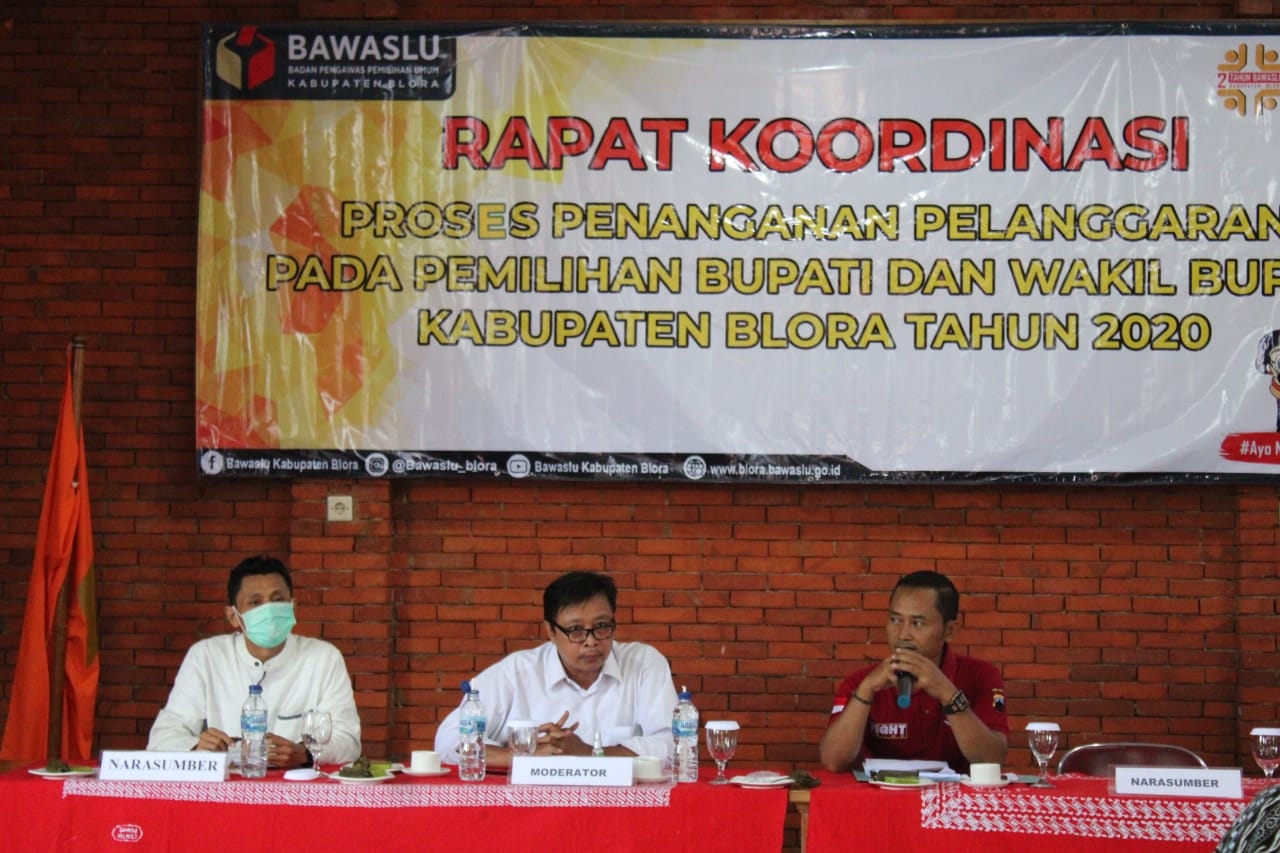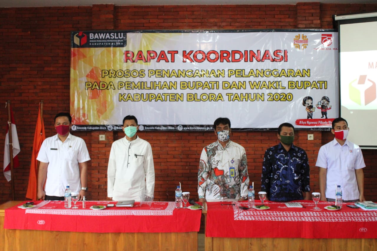 Blora - Badan Pengawas Pemilihan Umum (Bawaslu) Kabupaten Blora menggelar Rapat Koordinasi Proses Penanganan Pelanggaran pada Pemilihan Bupati dan Wakil Bupati Blora Tahun 2020 di Saung Mekarsari Karangjati Blora pada Rabu (12/8).