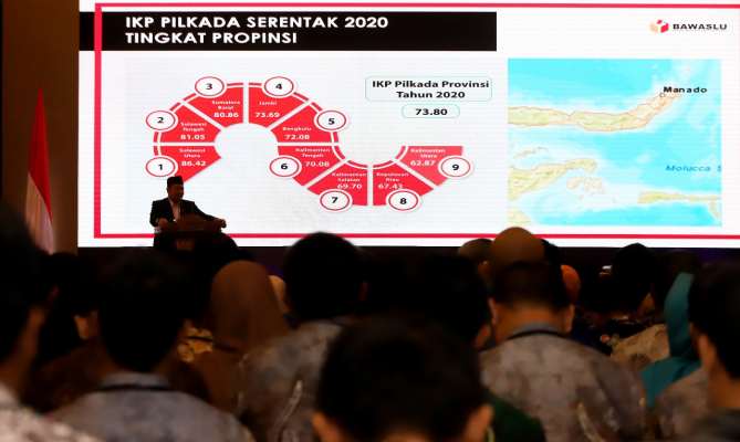 Jakarta, Badan Pengawas Pemilihan Umum - Keseluruhan sembilan provinsi yang menggelar pemilihan gubernur dan wakil gubernur (pilgub) masuk kategori dalam kategori rawan dari hasil Indeks Kerawanan Pemilu (IKP) Pilkada Serentak 2020. Secara berurutan provinsi yang masuk kategori paling rawan, yakni Sulawesi Utara (86,42), diikuti Sulawesi Tengah (81,05), Sumatra Barat (80,86), Jambi (73,69), Bengkulu (72,08), Kalimantan Tengah (70,08), Kalimantan Selatan (69,70), Kepulauan Riau (67,43), dan Kalimantan Utara (62,87).