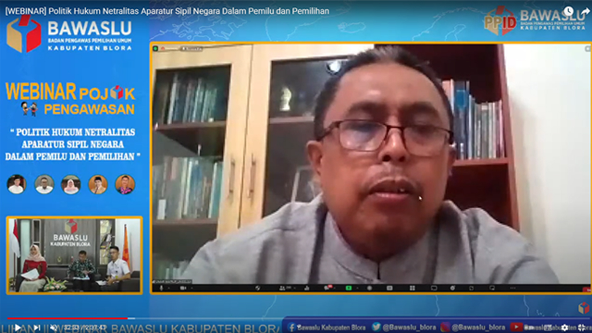 Hal inilah yang disorot oleh Umar Ma’ruf, akademisi Unissula Semarang dalam webinar “Politik Hukum Netralitas ASN dalam Pemilu dan Pemilihan” yang digelar oleh Bawaslu Blora pada Rabu (8/6). Menurut Umar, netralitas ASN tidak berbicara tentang formalitas, tetapi berbicara tentang substansi. “Netralitas ASN ini tidak berbicara tentang formalitas, namun berbicara tentang substansi. ASN harus berpikir bagaimana supaya bisa menjalankan tugas sesuai fungsi yang diamanatkan undang-undang ASN. Dia harus profesional, harus betul-betul menjadi pelayan masyarakat secara keseluruhan.” Ujarnya.