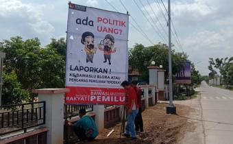 Blora - Badan Pengawas Pemilihan Umum (Bawaslu) Kabupaten Blora memasang sebanyak 360 alat peraga sosialisasi pengawasan berkaitan tolak politik uang dan netralitas ASN di seluruh Kecamatan dan Desa se-Kabupaten Blora yang terdiri dari spanduk dan baliho.